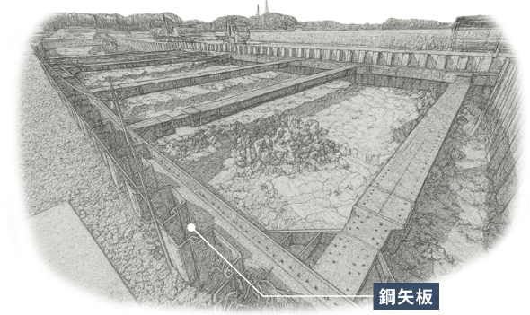 大規模な掘削工事では鋼矢板による土留めや支保工が必要となります。
