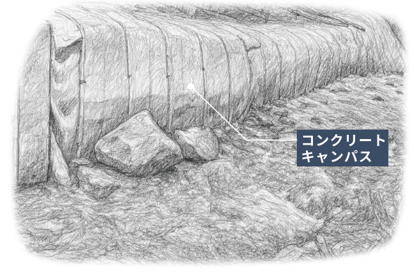 勾配がきつく、地上から約50mの高所でコンクリート供給が難しい現場において、布地を敷設し散水するだけで硬化する コンクリートキャンバス をご提案しました。この採用により、現場特有の課題を解決し、経済的かつスピーディーな施工 を実現。従来の施工方法では困難だった条件にも柔軟に対応することができました。